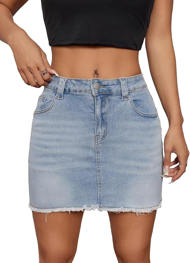 Women's High Waist Bodycon Denim Mini Skirt Y2K Raw Hem Jean Skirt