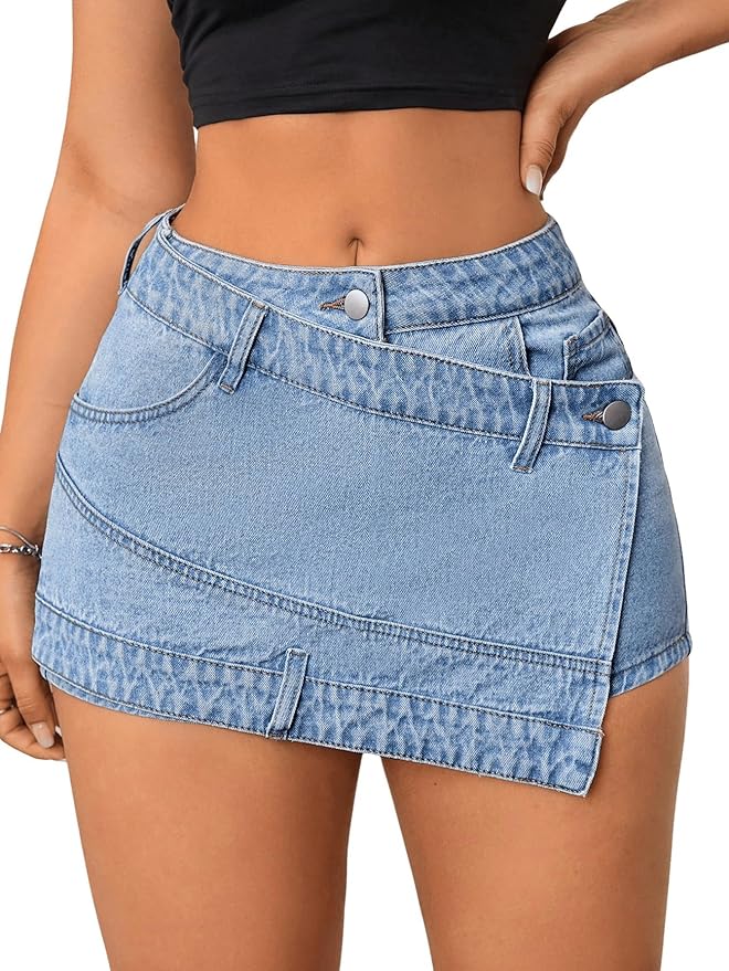 Women's High Waisted Jean Skort Asymmetrical Hem Button Denim Skirt Shorts with Pockets