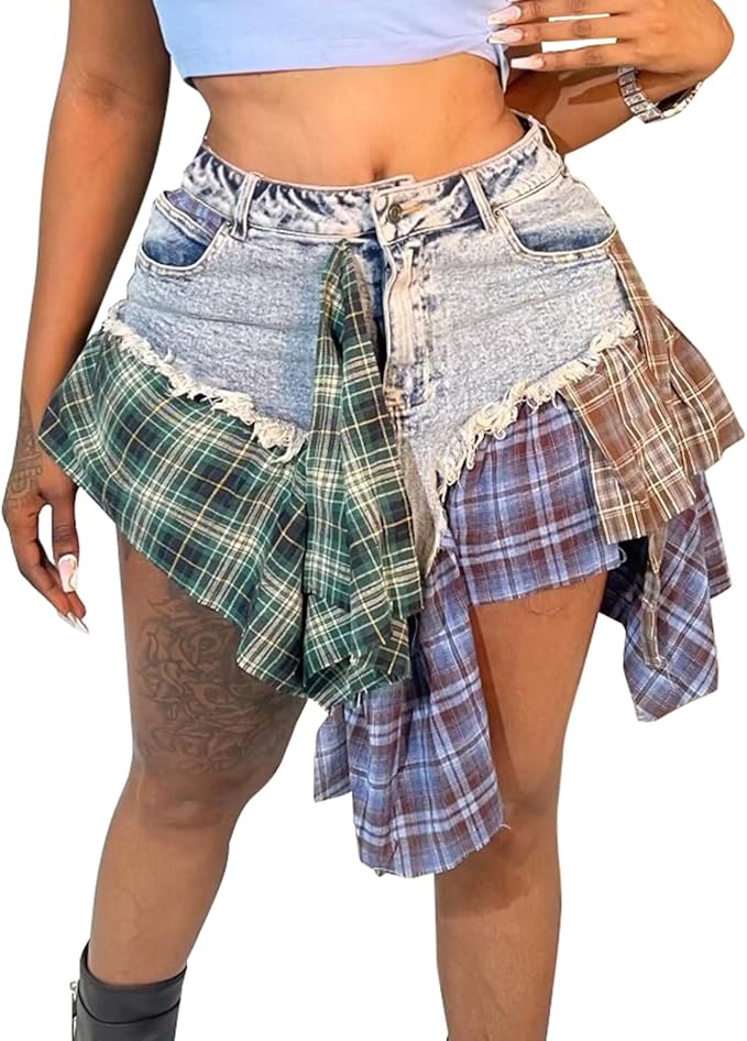 Skirts for Women Trendy Summer Denim Plaid Patchwork A Line High Waisted Mini Skirt