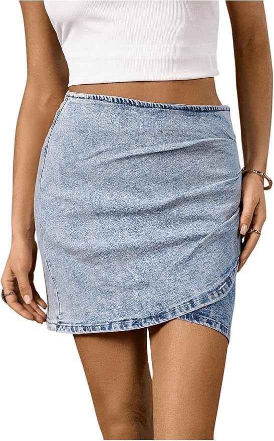 Women's Asymmetrical Hem Ruched Denim Skirt High Waisted Zip Back Jean Mini Skirts