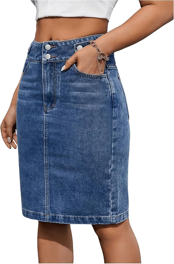 Womens Front Slit Thigh Denim Skirt High Waist Casual Midi Length Jean Skirt for Curvy Females