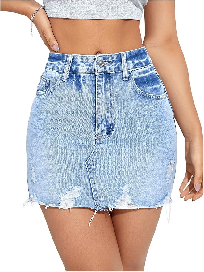 Women's Casual Ripped Jean Skirt High Waist Raw Hem Mini Denim Skirts