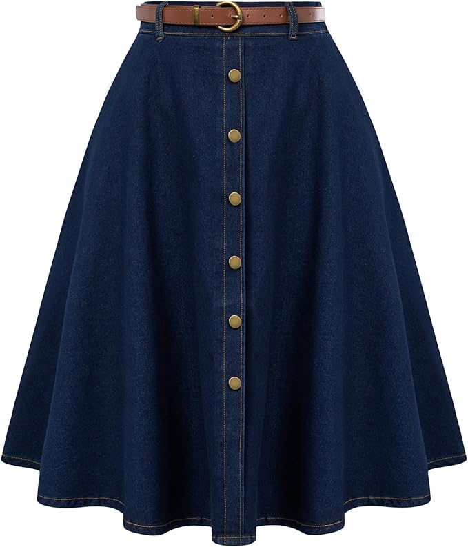 Women's Denim Skirts Vintage Below Knee Length High Waist A-Line Jean Skirts with Pockets