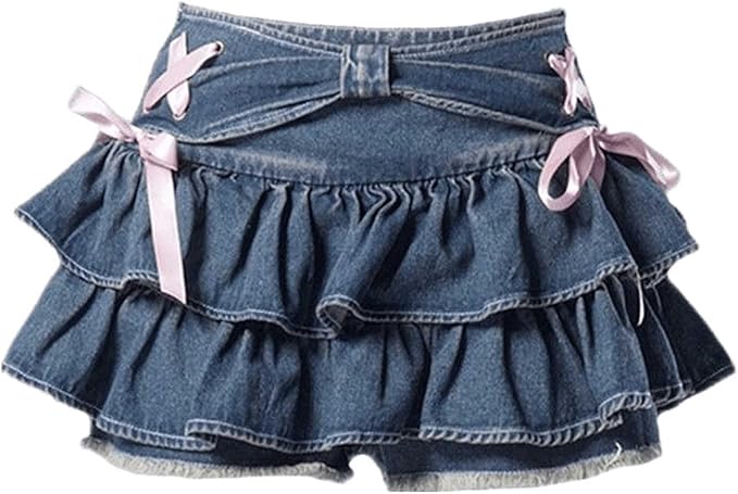 Women's Bow Low Waist Retro Pleated Skirt with Adjustable Waist A-line Mini Denim Skirt Y2K