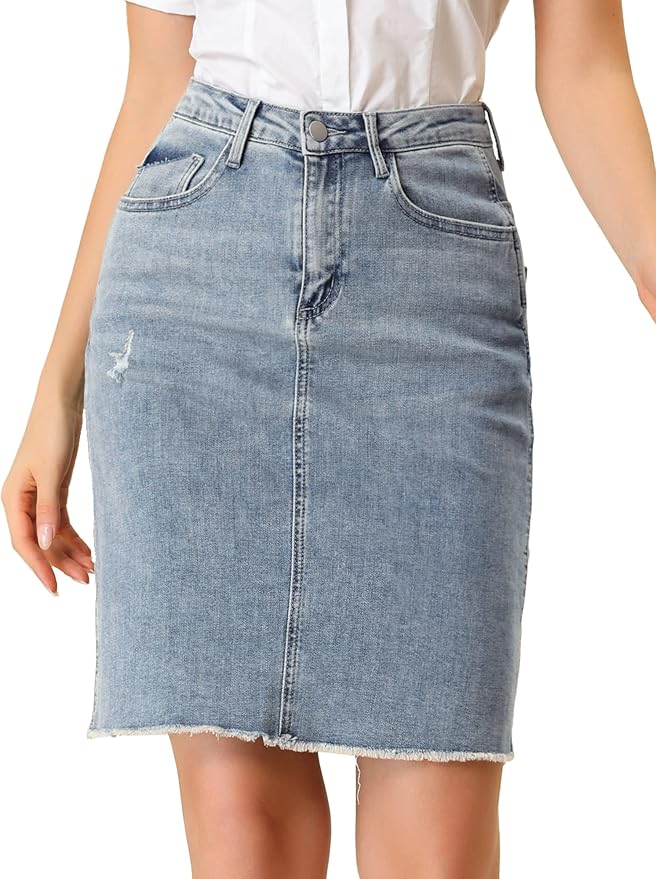 Women's Basic Distressed High Waist Ripped Hem Washed Jeans Denim Skirt