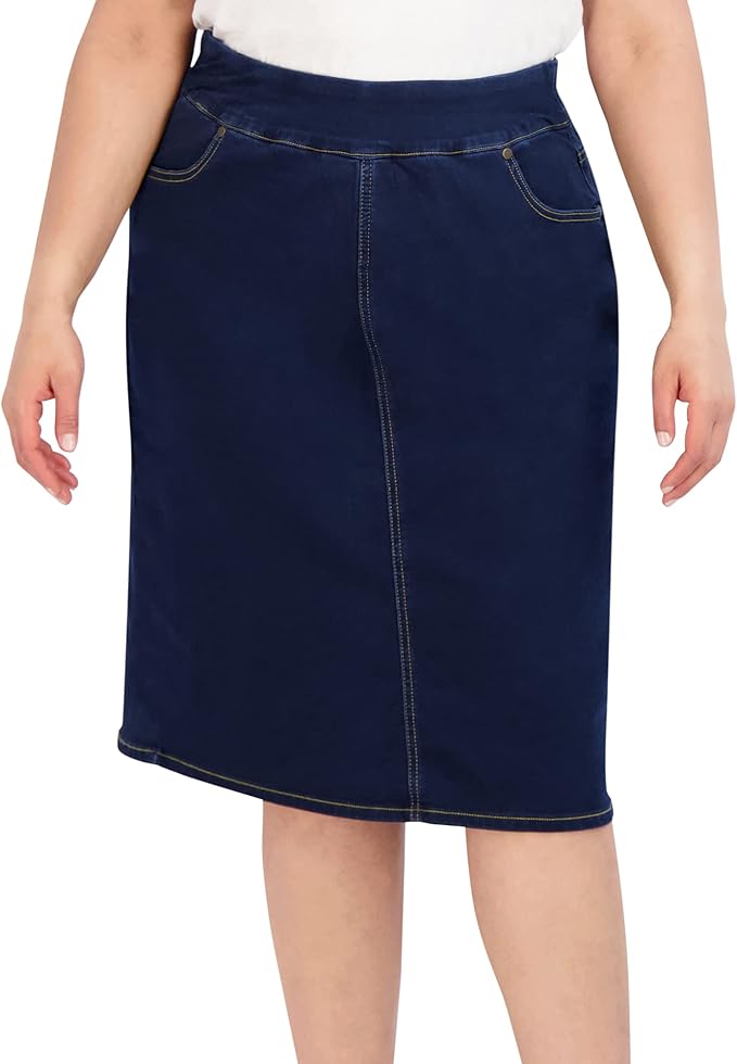 Pull On Knit Denim Skirt for Women - Easy to Put On & Take Off Jean Skirt - Skirt w/Pockets & Comfort Waist Band