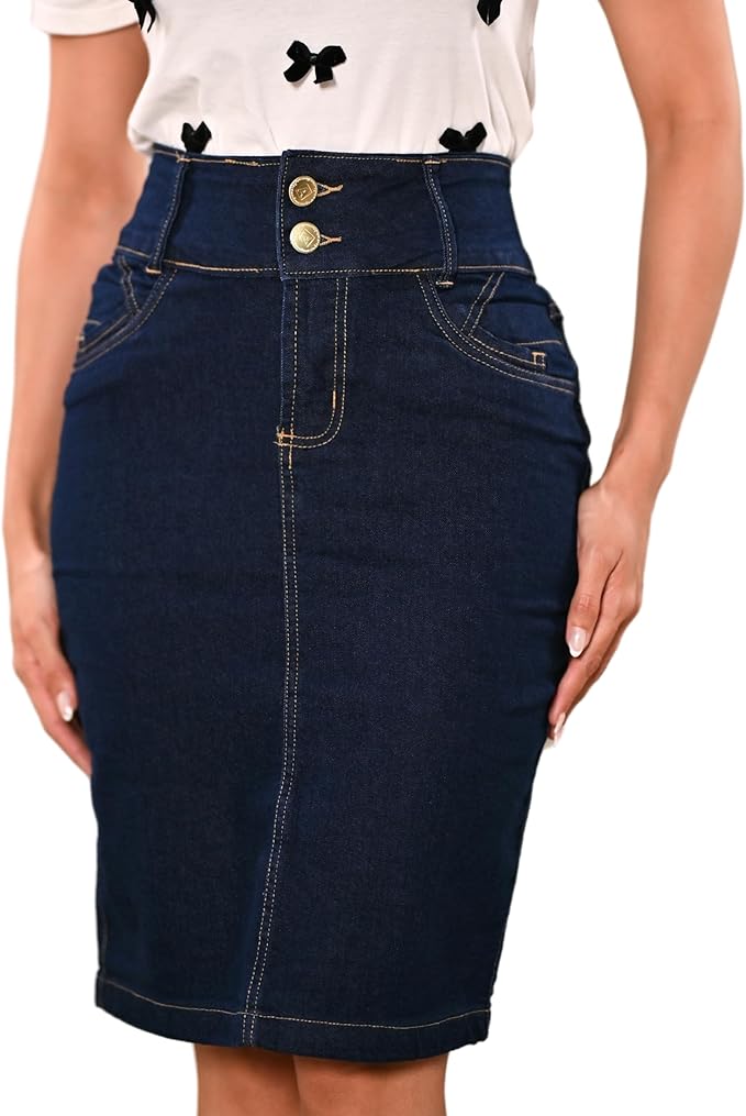 Straight Knee Length Stretch Denim Jean Skirt for Women, Regular and Plus Size