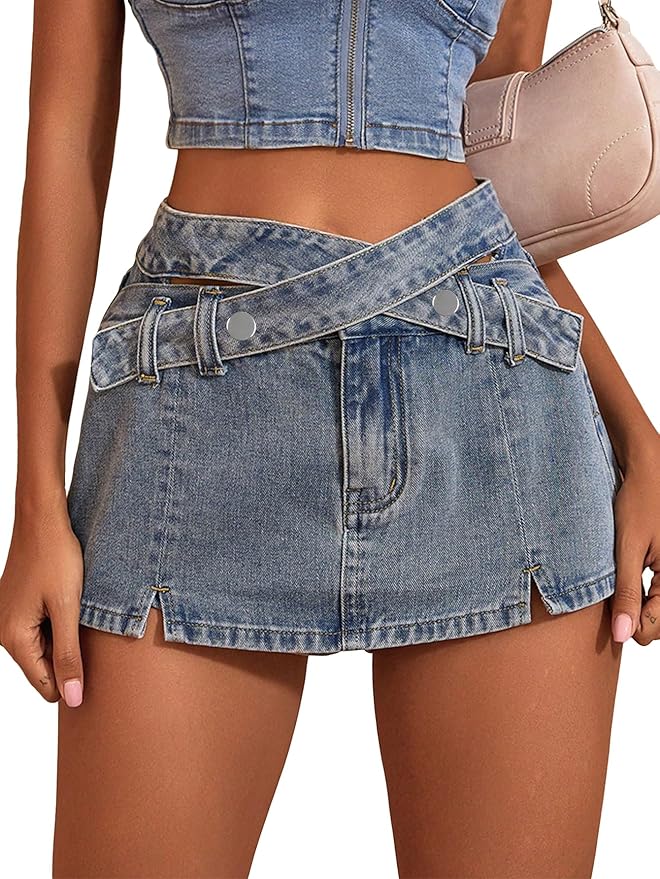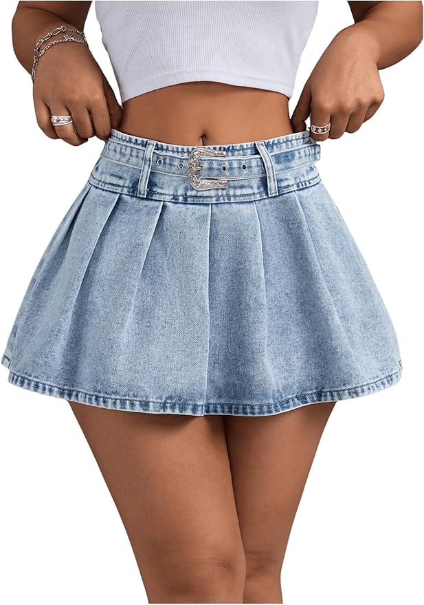 Women's Low Rise Pleated Denim Mini Skirt Belted Y2k Summer Jean Mini Skirt