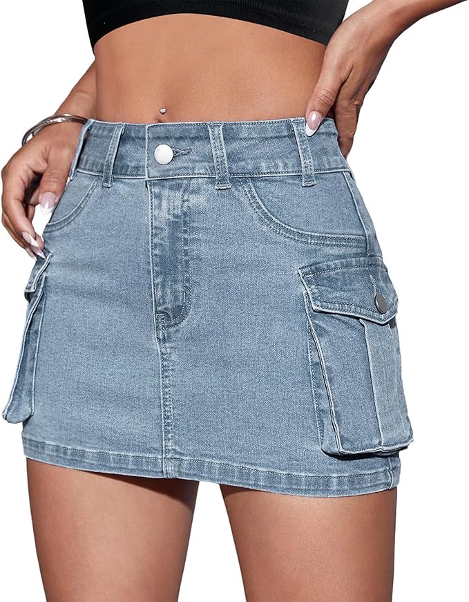 Jean Skirts for Women Denim Stretchy Cargo High Waisted Trendy Y2K Mini Skirt with Utility Pockets