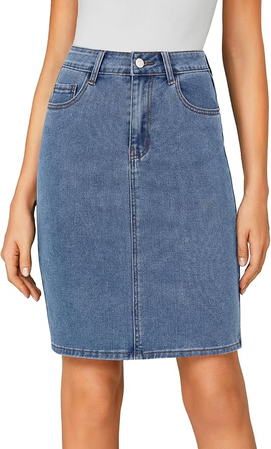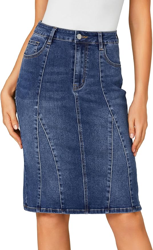 Women's Casual Denim High Waisted Stretch Bodycon Pencil Knee Length Straight Jean Midi Skirt with Pockets