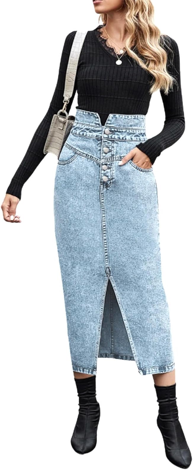 Women's High Waisted Slit Button up Midi Jean Skirt High Split Casual Denim Long Skirts