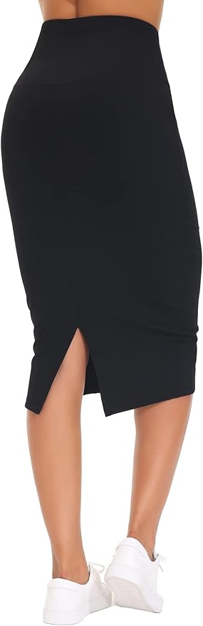 Women's High Waist Tummy Control Pencil Skirts Stretchy Bodycon Midi Skirt Below Knee with Back Slit